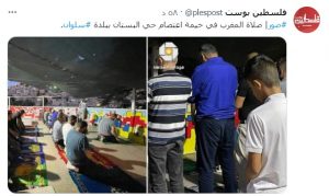 كما نشر موقع فلسطين بوست على حسابه على منصات التواصل، صوراً لصلاة المغرب من احدى مخيمات الاعتصام بحي البستان في بلدة سلوان