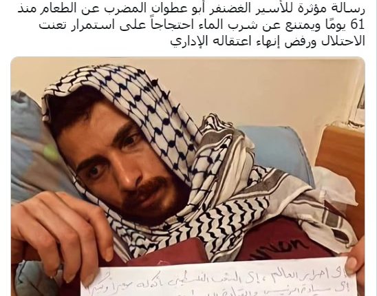 متابعات المنهاج نت – نشرت وكالة شهاب للأبناء عبر حسابها الرسمي بمنصة التواصل الاجتماعي تويتر رسالة مؤثرة الأسير الغضنفر أبو عطوان المضرب عن الطعام منذ 61 يومًا الذي يمتنع عن شرب الماء احتجاجاً على استمرار تعنت الاحتلال ورفض إنهاء اعتقاله الإداري.
