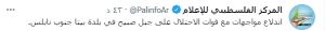 متابعات المنهاج نت – قال المركز الفلسطيني للإعلام، على حسابه الرسمي في منصات التواصل الاجتماعي تويتر، أن اندلاع المواجهات ليلة مع قوات الاحتلال الصهيوني على جبل صبيح في بلدة بيتا جنوب نلبس.