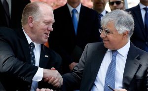 نائب مدير الهجرة والجمارك توماس هومان، إلى اليسار، يصافح السفير العراقي فريد ياسين، خلال حفل لإعادة القطع الأثرية القديمة إلى العراق،واشنطن، 2 مايو 2018