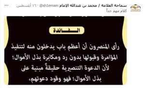 واضاف أن المنصرون وجدوا اعظم وسيلة في سبيل نشر دعوتهم هي الغزو المالي الذي يسخر لإستقطاب الشباب، مضيفاً أن حقيقة الدعوة التنصيرية مبنية على بذل الاموال مضيفاً في تغريدته “أن المال هو وقود الدعوة التنصيرية”.