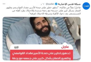 ونقلاً عن شبكة فلسطين الاخبارية أن عائلة الأسير مقداد القواسمي أنها صرحت بتدهور صحته الجسدية جراء الإضراب المفتوح الذي أعلنه سابقاً مشيرةً الى إصفرار جسده النحيل والارتجاف الحاصل الذي بات واضحاً وجلياً عليه نتيجة الاضراب
