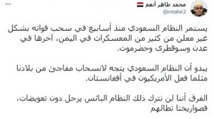 غرد الأستاذ محمد طاهر انعم، عضو الهيئة العليا لحزب الرشاد السلفي، ورابطة علماء اليمن على حسابه الشخصي في تويتر قائلاً “يستمر النظام السعودي منذ أسابيع في سحب قواته بشكل غير معلن من كثير من المعسكرات في اليمن، آخرها في عدن وسقطرى وحضرموت”.