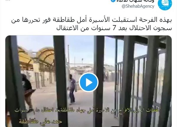 من مواقع التواصل On نوفمبر 30, 2021 بهذه الفرحة استقبلت الأسيرة أمل طقاطقة فور تحررها من سجون الاحتلال بعد 7 سنوات من الاعتقال pic.twitter.com/fmHPaEBauu — وكالة شهاب للأنباء (@ShehabAgency) November 30, 2021 #العدو_الإسرائيلي#فلسطين_المحتلة مشاركة