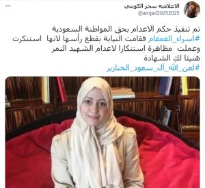 من مواقع التواصل .. نشطاء عرب يستنكرون إعدام النظام السعودي لـ إسراء الغمام