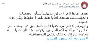 كما عبر الناشط الإعلامي حسين أبو علي على صفحته الشخصية على تويتر “بعدما أهانوا المرأة تباكوا عليها. وأنشأوا الجمعيات والمؤسسات عندهم لعلّها تعيد للمرأة حقوقها ولكن دون جدوى”