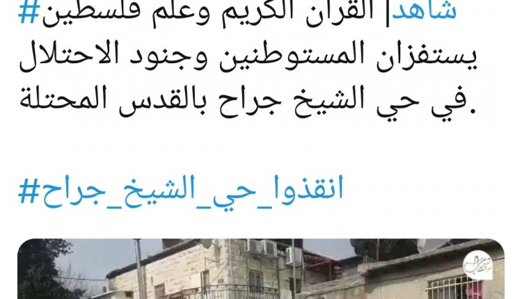 On فبراير 20, 2022 "بحضور عضو الكنيست المتطرف إيتمار بن غفير"..#شاهد| القرآن الكريم وعلم فلسطين يستفزان المستوطنين وجنود الاحتلال في حي الشيخ جراح بالقدس المحتلة.#انقذوا_حي_الشيخ_جراح pic.twitter.com/FItsH7ZF2C — وكالة شهاب للأنباء (@ShehabAgency) February 20, 2022 #العدو_الإسرائيلي#حي_الشيخ_جراح#فلسطين_المحتلة مشاركة