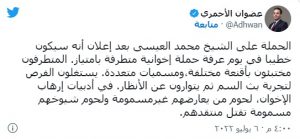 الجدير ذكره أن العيسى زار “معسكر الإبادة الجماعية لليهود في بولندا إبان الحرب العالمية الثانية، أوشفيتز، وذلك بالتزامن مع إحياء ذكرى الهولوكوست عام 2020 وصلى في الموقع برفقة عدد من رجال الدين السنة والشيعة” وفق ما نشر الحساب الرسمي الناطق بالعربية لوزارة خارجية العدو الإسرائيلي.