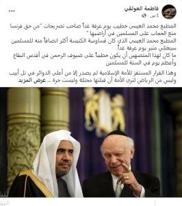 من جانبها كتبت الناشطة فاطمة العولقي على صفحتها فيس بوك “ما كان لهذا المتصهين أن يكون خطيباً على ضيوف الرحمن في أقدس البقاع وأعظم يوم في السنة للمسلمين” مشيرةً الى خطابه المنحط تجاه المرأة المسلمة في فرنسا.