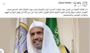 كما أصدرت دار الإفتاء الليبية من ضمن عشر هيئات قرارا بالإجماع بعدم جواز الصلاة خلف محمد العيسى خطيب يوم عرفة.