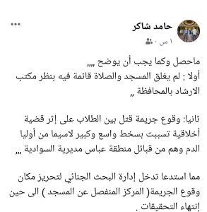 وأوضح بالقول: وقوع جريمة قتل بين الطلاب على إثر قضية أخلاقية تسببت بسخط واسع وكبير لاسيما من أوليا الدم وهم من قبائل منطقة عباس مديرية السوادية.