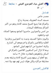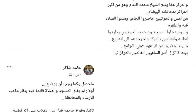 كما رد الناشط حامد شاكر على ما نشره عباد العوجري من اخبار تفيد بأن الحوثيين منعوا الصلاة بمسجد السنة التابع للشيخ محمد الامام بمدينة رداع محافظة البيضاء .