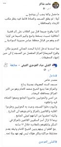 وقال حامد شاكر في رده ” لم يغلق المسجد والصلاة قائمة فيه بنظر مكتب الارشاد بالمحافظة”
