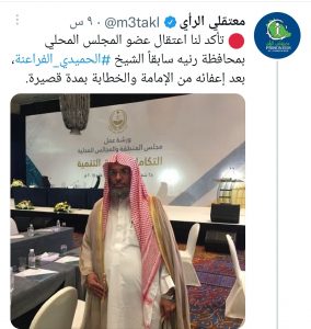وأكد المصدر بأن النظام السعودي أعتقل الشيخ الحميدي الفراعنة عضو المجلس المحلي بمحافظة رنيه السعودية بعد تسريحه من الإمامة والخطابة في مسجد الجدر بالمحافظة.