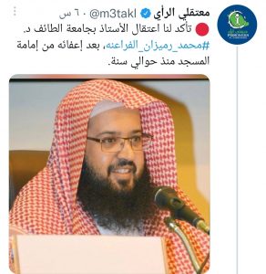 وبحسب حساب ” معتقلي الرأي” في تغريدةً على تويتر بأن السلطات السعودية اعتقلت الشيخ الدكتور محمد رميزان الفراعنة بجامعة الطائف بعد أن تم إبعاده من الخطابة في سبتمبر الماضي لهذا العام.