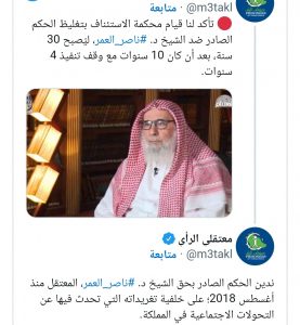 وقال حساب المعتقلين أن محكمة الإستئناف بتغليظ الحكم الصادر ضد الشيخ الدكتور ناصر العمر لـ 30 عاماً بعد إن كان 10 سنوات.