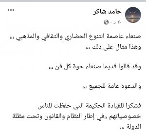 من جانبه كتب “حامد شاكر” على حسابه الشخصي فيس بوك: “صنعاء عاصمة التنوع الحضاري والثقافي والمذهبي” مشيراً الى اقوال القدماء بأن صنعاء حوة كل فن حسب تعبيره.