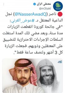 ونقلاً عن حساب معتقلي الرأي الرسمي والمتخصص بقضايا “معتقلي الرأي” بأن نجل الشيخ القرني قال : “في جائحة كورونا انقطعت الزيارات مدة سنة، وبعد مضي تلك المدة استغلت السلطات الإجراءات الاحترازية للتضييق على المعتقلين وذويهم، فجعلت الزيارة كل 3 أشهر ولنصف ساعة فقط”.