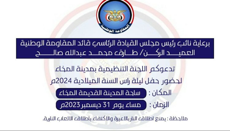 المنهاج نت – دعا العميد طارق صالح، “عضو مجلس القيادة الرئاسي” أنصاره من ضباط وافراد قوات حراس الجمهورية للإحتشاد الى ساحة المدينة القديمة بالمخاء للاحتفال بأعياد الميلاد “الكرسمس” اليوم. موجهاً  بإطلاق الالعاب النارية فقط.