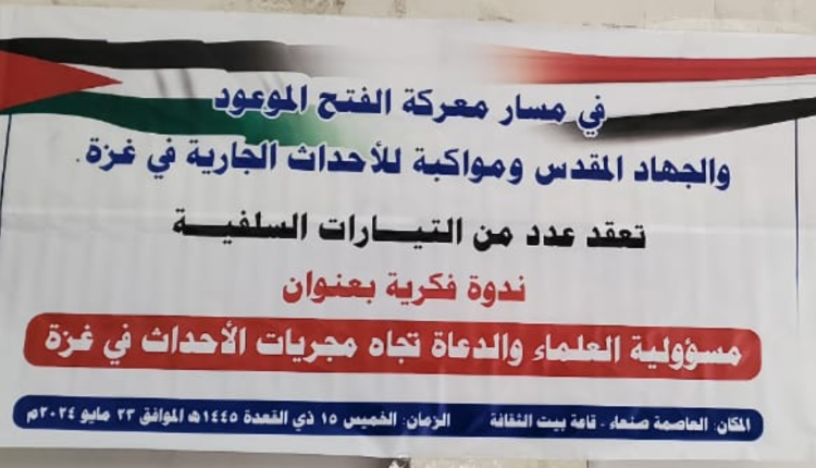 في مسار معركة الفتح الموعود والجهاد المقدس ومواكبة الاحداث الجارية في غزة. نظمَّ عدداً من التيارات السلفية” اليوم بصنعاء، ندوة فكرية.