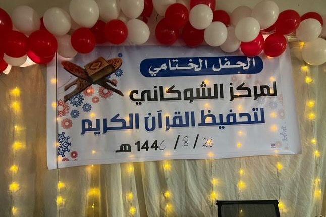اقام مسجد الشوكاني بحي الأصبحي في صنعاء، أمس، الحفل الختامي لمدرسة الشوكاني النسائية الملحق الخارجي للمسجد، لتحفيظ القرآن الكريم، ليشهد تكريم حافظات كتاب الله، وطالبات التحفيظ ومحو الأمية، بالإضافة إلى تكريم المدرسات اللاتي بذلن جهودًا مضنية في سبيل تعليم وتنشئة جيل قرآني واعد.