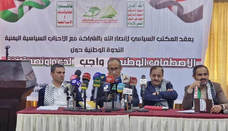 نظّم المكتب السياسي لأنصار الله مع تحالف من الأحزاب السياسية ندوة وطنية موسعة بعنوان “الاصطفاف الوطني واجب لدعم ونصرة غزة”، جددت خلاله القيادات الحزبية موقف اليمن الثابت مع الشعب الفلسطيني وبرفضها لأي محاولات تستهدف النيل من القضية الفلسطينية.