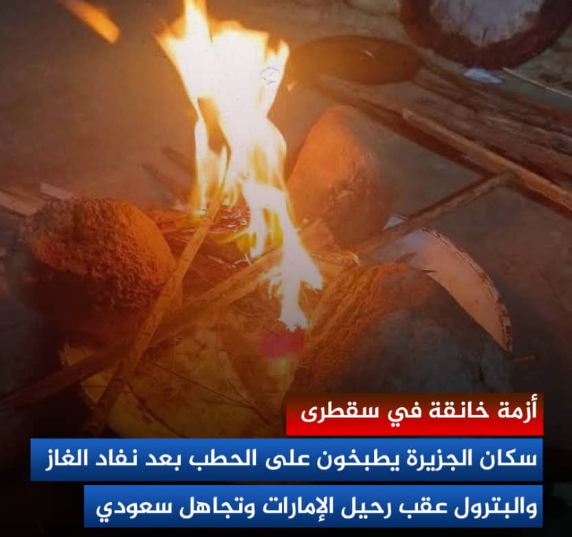 تشهد جزيرة سقطرى اليمنية أزمة إنسانية حادة نتيجة نفاد إمدادات الغاز والبترول، بعد انسحاب الإمارات من الجزيرة وإهمال سعودي لوضعها الطارئ. وتحول السكان إلى استخدام الحطب للطهي في ظل غياب أي تدخل من جانب ما تسمى بالشرعية وانعدام بدائل طاقة فعلية.